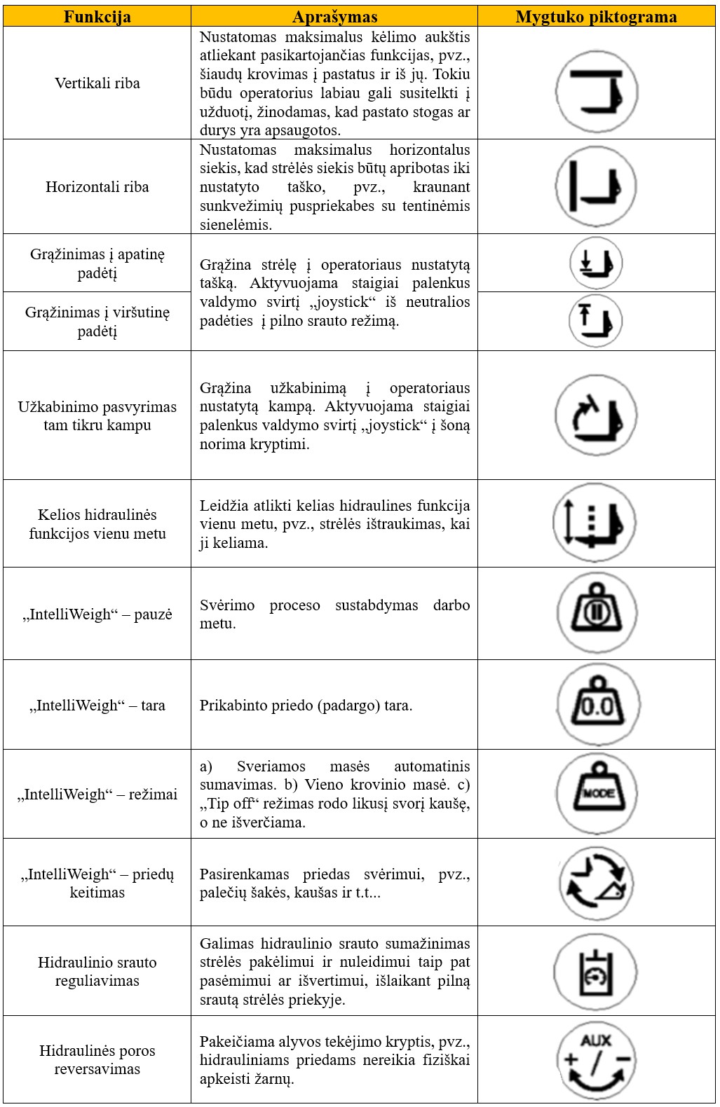 1 lentelė. Hidraulinių funkcijų piktogramos su aprašymais